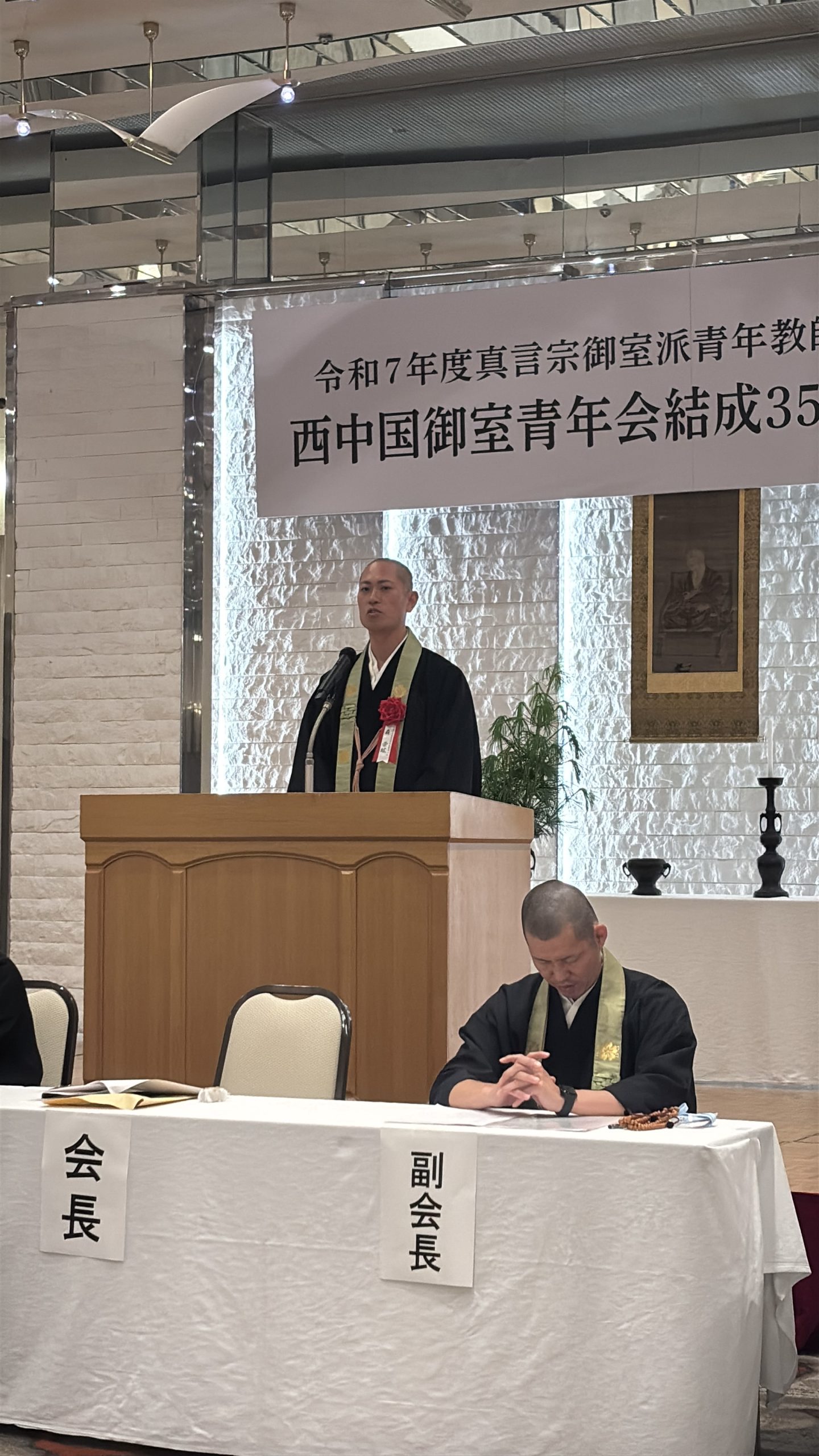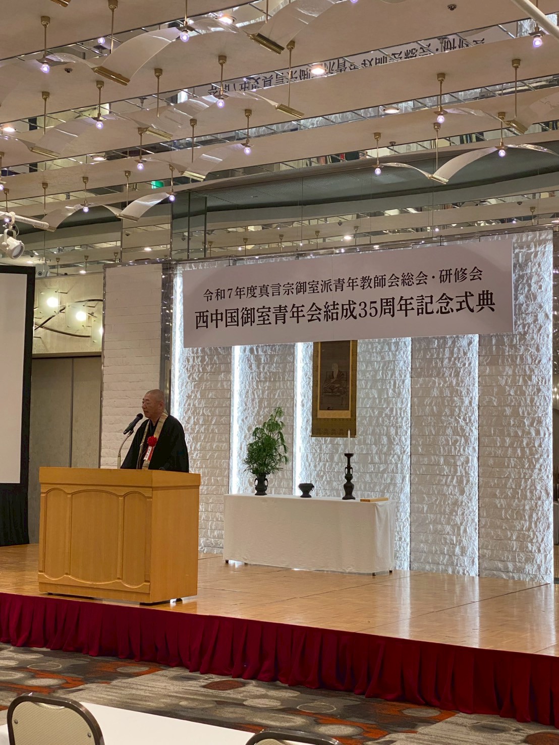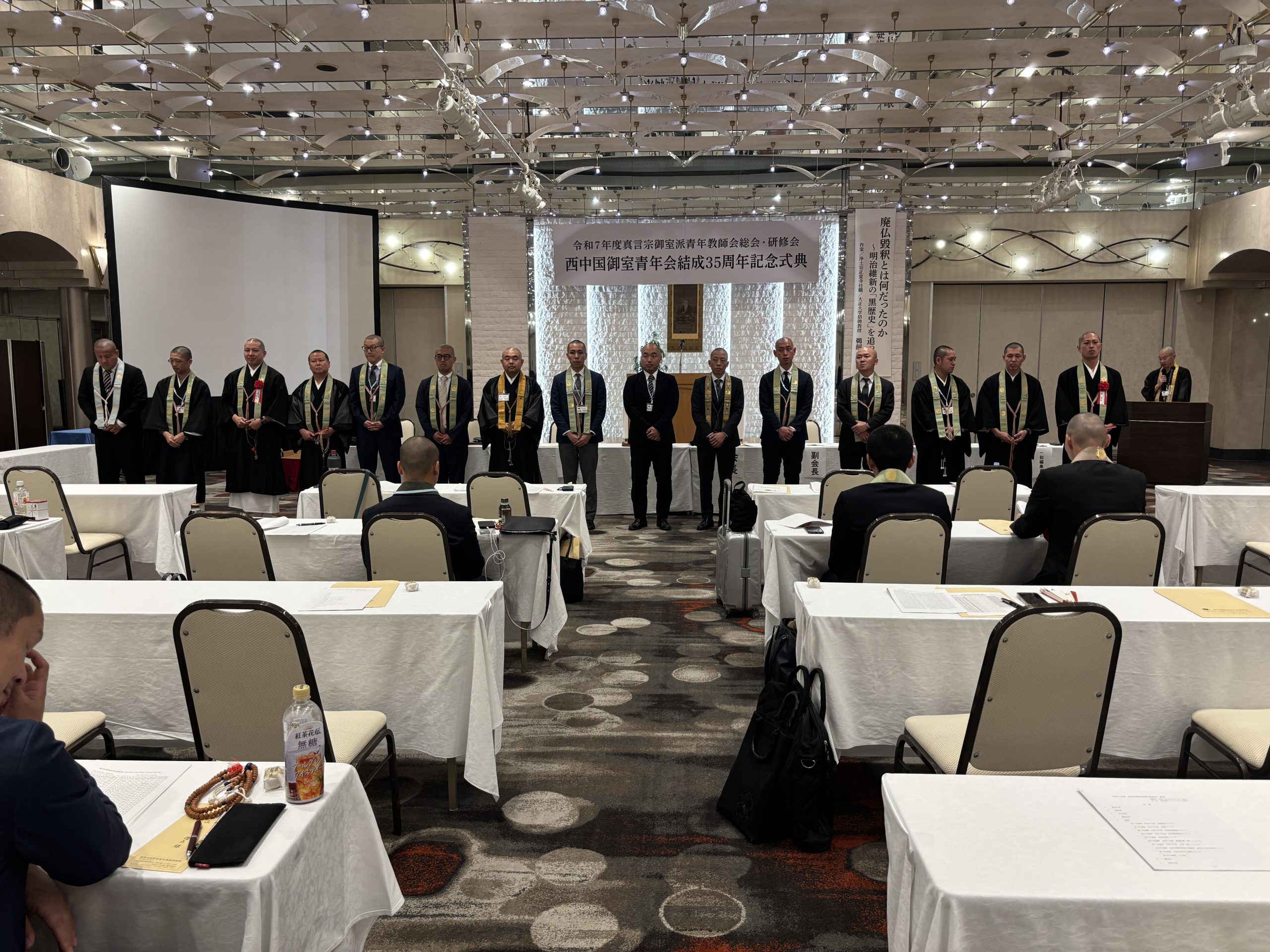 山口 西長寺 川西恵阿西中国御室青年会では令和7年6月23日、山口県湯田温泉ユウベルホテル松政において35周年記念式典・祝賀会、並びに真言宗御室派青年教師会総会・研修会『廃仏毀釈とは何だったのか~明治維新の「黒歴史」を追って~』講師鵜飼秀徳師を講師にお迎えして執り行いました。 35周年記念式典では、山口支所長 西園尚司僧正、広島支所長 小田信明僧正をはじめ、西中国御室青年会第7・8代会長 三池孝道僧正、第10代会長 三池尚道僧正、各地区御室青年会会長、他多数の御来駕を賜りました。また、たくさんの真言宗御室派青年教師会会員の皆様にご参加を頂戴しました。式典では厳粛な中、第17代会長八木宏雅様より挨拶を申し上げました。 平成2年発足以来、山口・広島・鳥取・島根の四県で長きに亘、研鑽と交流が続けて来られましたのもひとえに歴代諸大徳方の篤いご支援と温かい激励の賜物でございます。ここに会員一同、心より感謝を申し上げます。 今後とも「魅せちゃる 西中国」のスローガンの元、学びと刺激を共有しながら研鑽をしてまいる所存です。