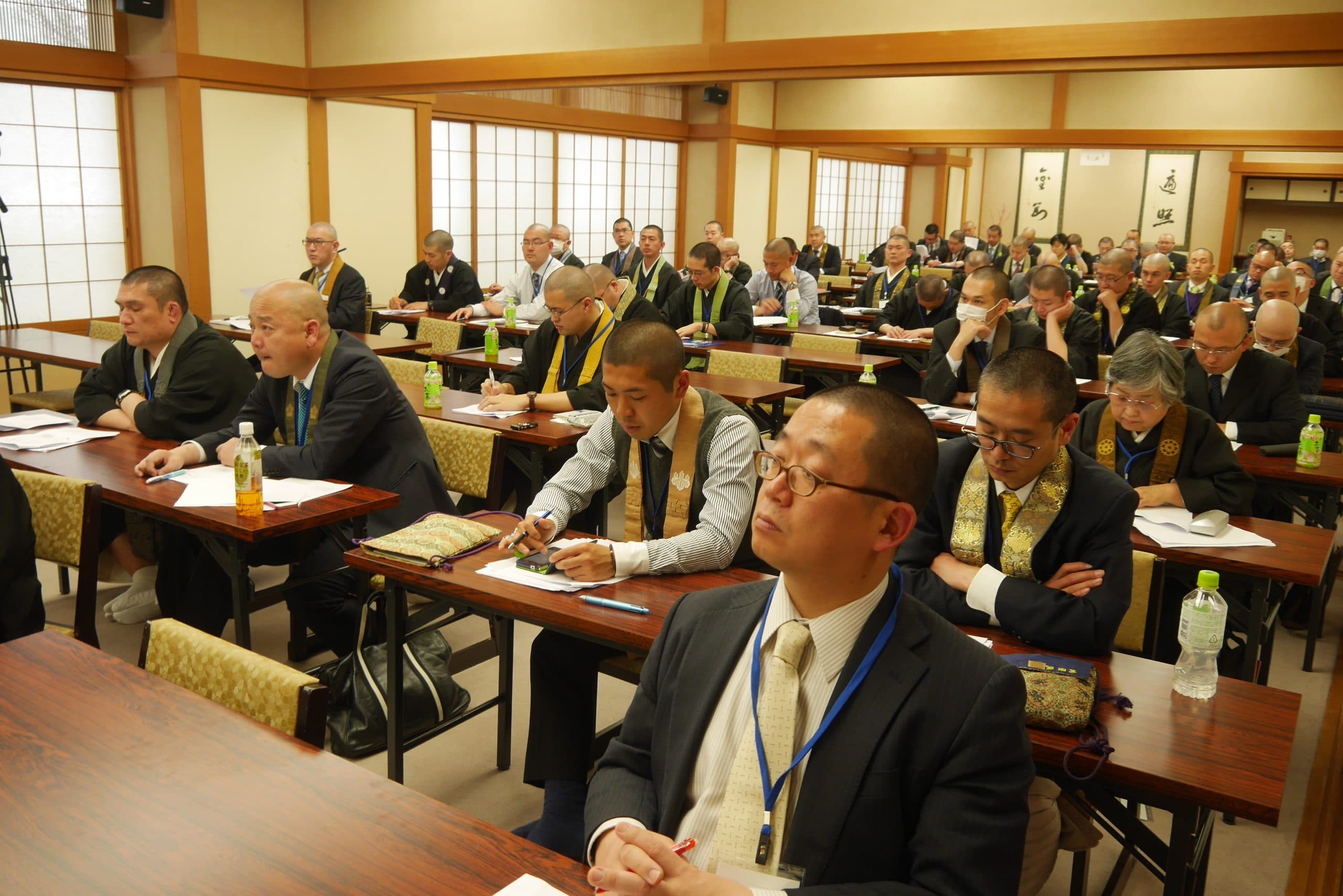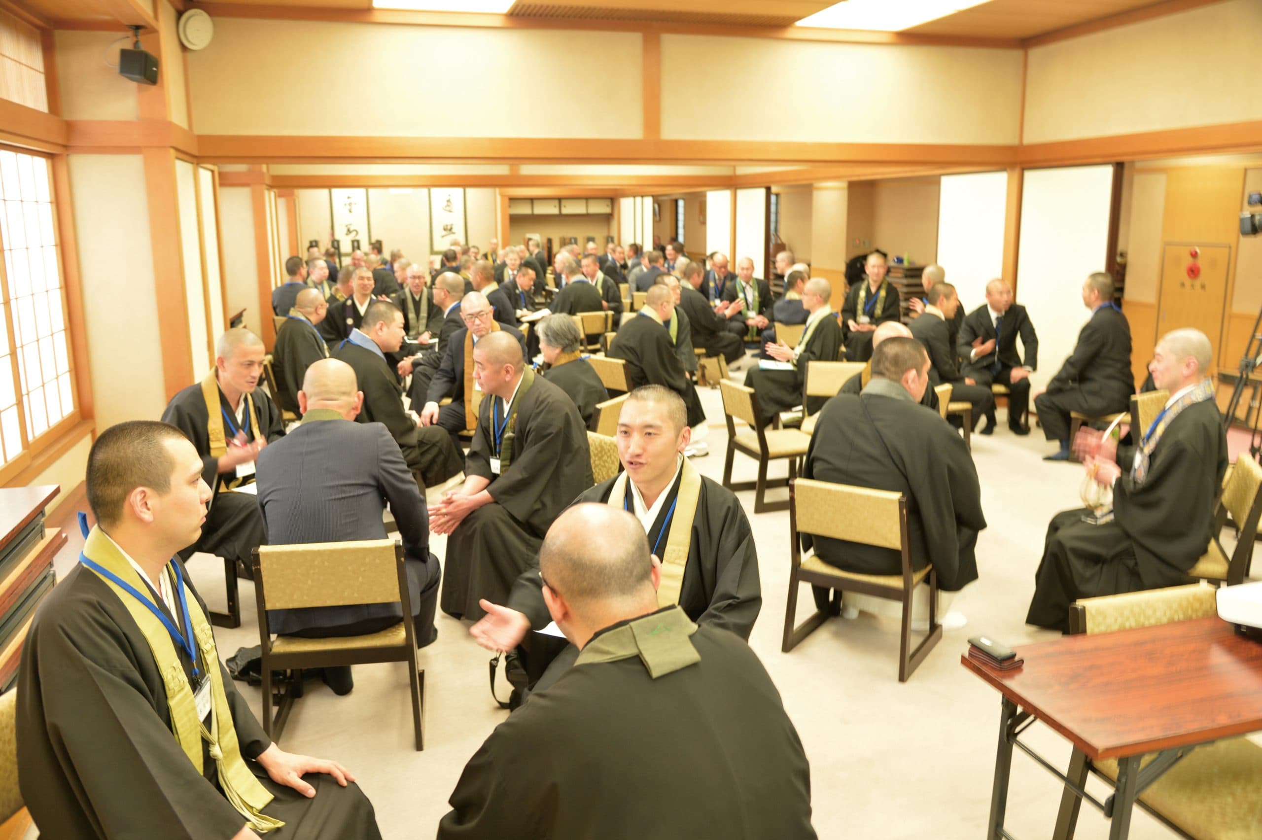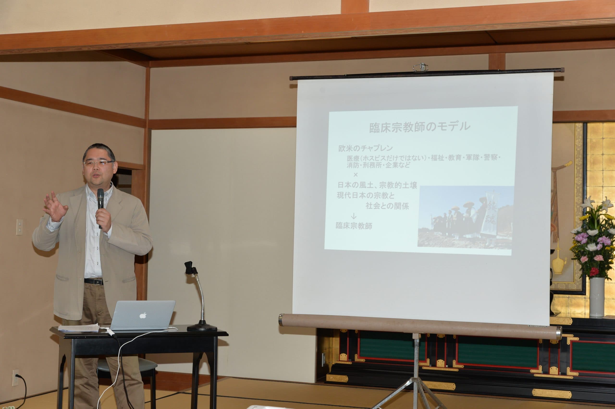 広島 薬師寺 鈴木宏章「臨床宗教師」とは、病院、社会福祉施設、被災地等の公共空間において、宗教勧誘や布教を目的とせず、相手の価値観や信仰を尊重し、心のケアを行う宗教者のことです。東日本大震災後の被災者支援を契機に、東北大学を皮切りに、龍谷、高野山、種智院等の各大学でその養成が始まっており、先日その体験プログラムが、全青連災害救援研修会として高野山東京別院にて開催されました。まず、臨床宗教師として活動中の、曹洞宗普門寺(宮城県栗原市)高橋悦堂師が、東日本大震災での宗教者の活動についてスライドを上映しながら説明され、続いて、浄土真宗の僧侶で、東北大学の臨床宗教師研修の指導者でもある谷山洋三師が、臨床宗教師の理念と倫理等について講義された後、話し役・聴き役・観察役の三人一組に分かれてのワークショップを体験しました。各派から参加した約九〇名は熱心に受講し、最後に、本堂で震災物故者追悼法会を厳修して犠牲者の冥福を祈り、全日程を終えました。