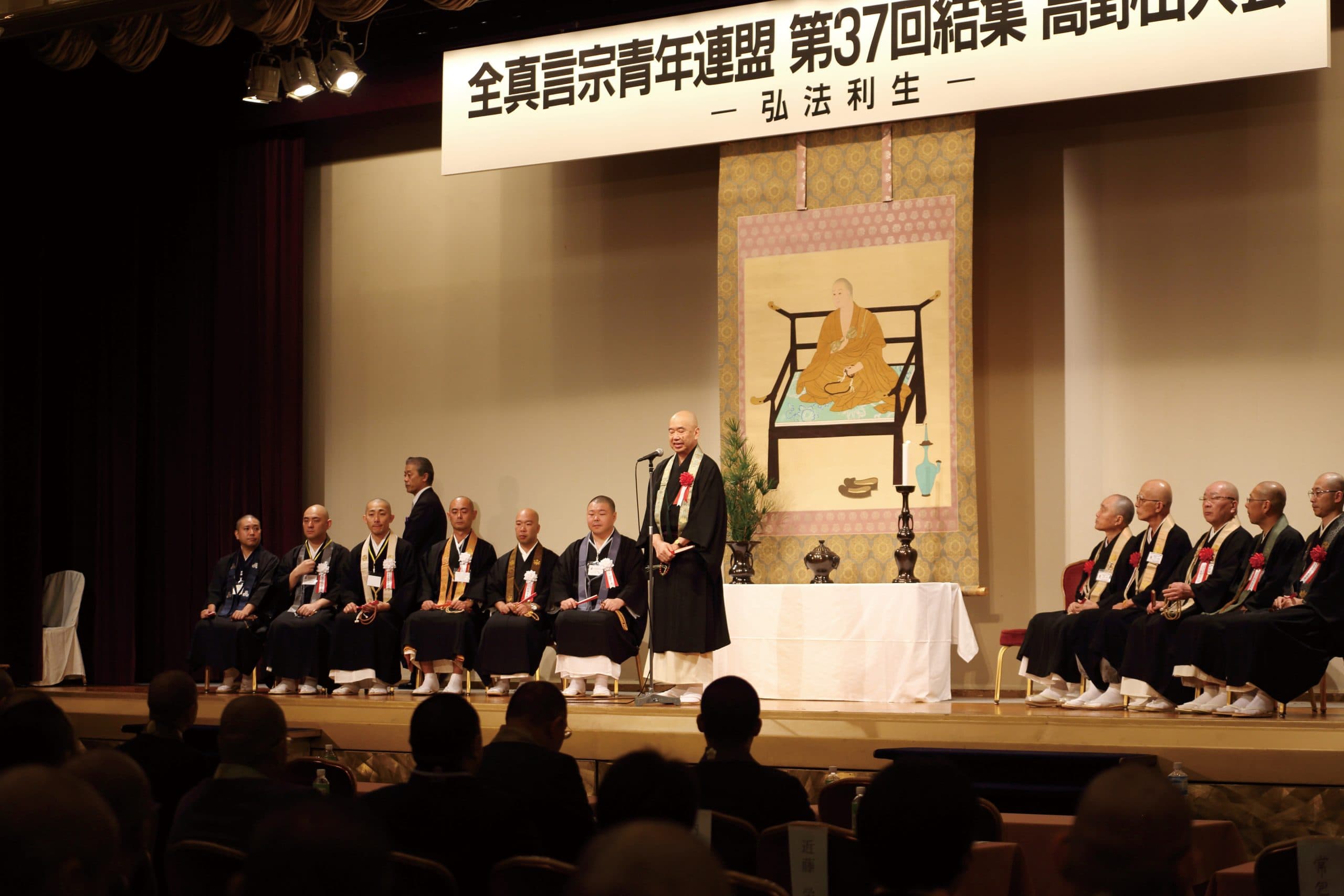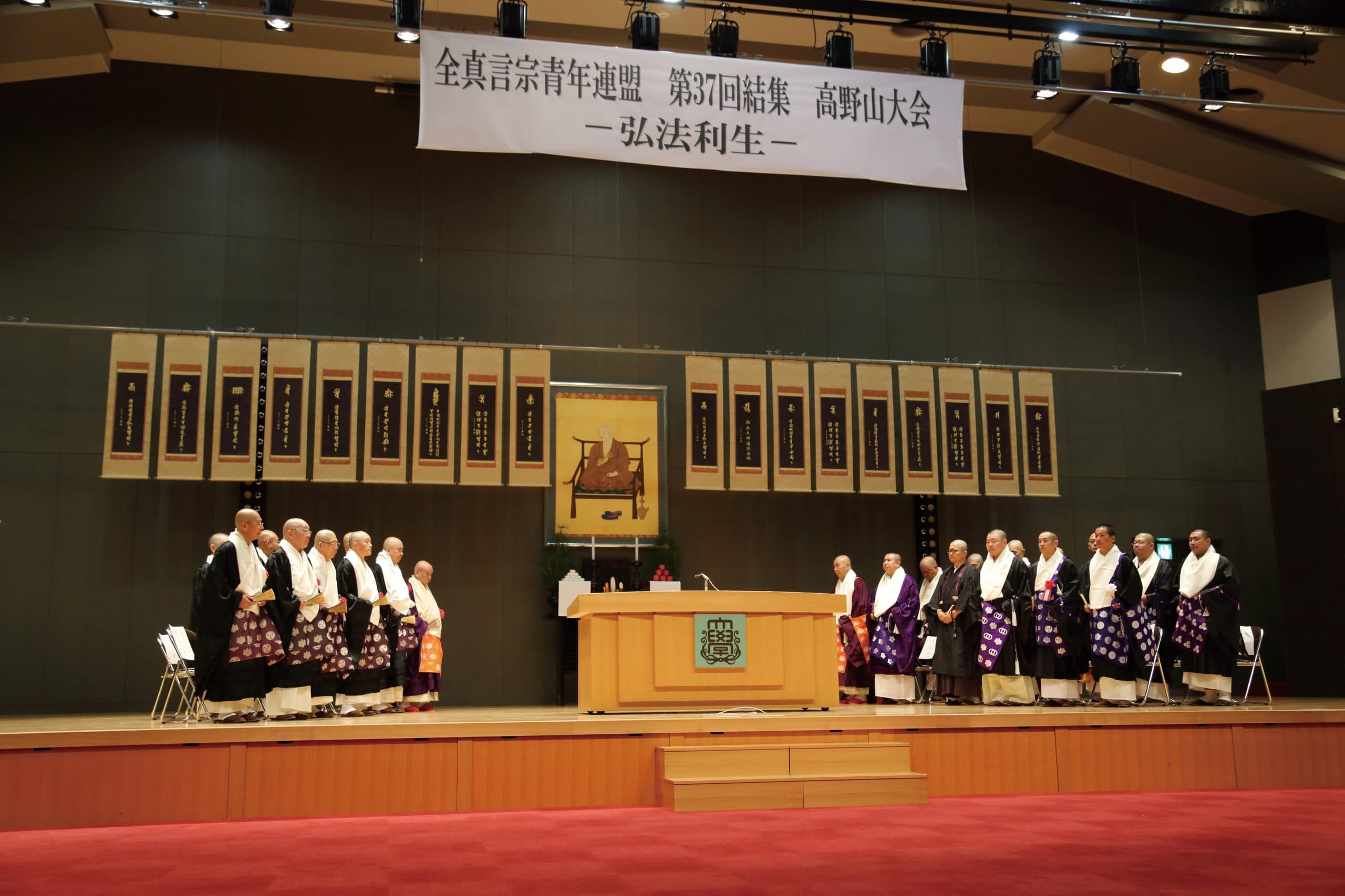 10月18・19日の2日間、「弘法利生」のテーマのもと 全真言宗青年連盟第37回結集高野山大会が開催されました。 1日目は壇上伽藍の諸堂において、合同法会を厳修いたしました。 2日目は松長有慶大僧正、高木訷元大僧正による講演・記念対談を拝聴させていただきました。