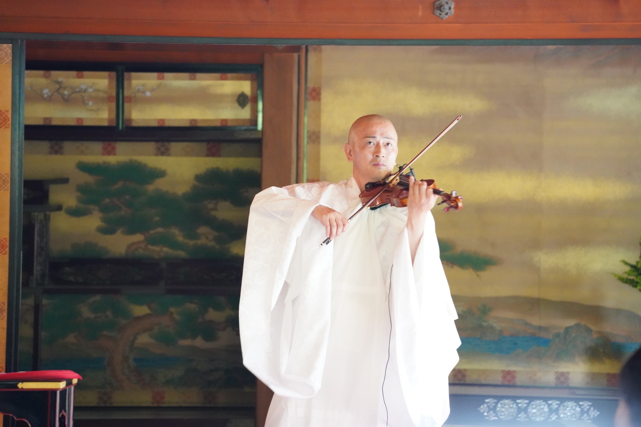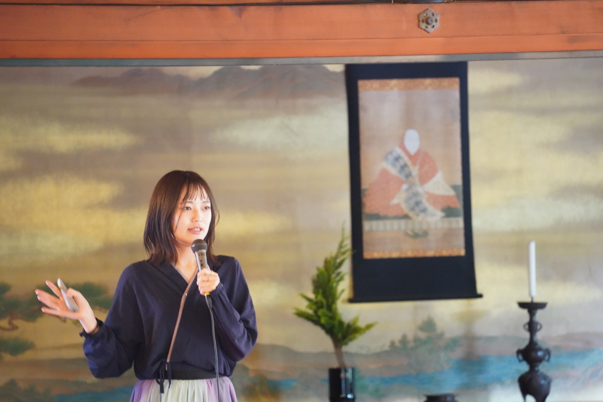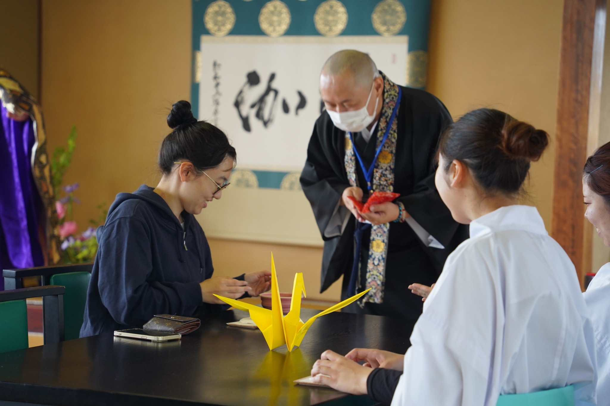 今回、おむろ超縁日に初日だけですが、大内の間でのお抹茶サロンのお手伝いとして参加させていただきました。 お抹茶サロンでは抹茶とお菓子を出して少し雑談をさせていただきましたが、遠方からこの日の為に来られた方が多く見受けられたように思います。全体の約2割は外国人の方もお抹茶を体験し、お抹茶を飲みながら法衣に興味を持っているという感じが印象的でした。 誰かが法衣を着てみたいと手に取り着ていると、他のお客様は全員その方に注目をして、衲衣など普段目にすることができない衣体をどうやって着るのか、この法衣はどこで使用するんだろう、みたいな疑問を持ちながら着ている法衣を無我夢中で眺めていました。 時には外国人の方が法衣を纏ったとき、背が高く衣装が似合っているときには、拍手等をしてお抹茶サロンの空間が皆様で1つに統一されている様な場面もありました。 参拝者の方と話をしていると、世間話から政治の話をする方もおられたりと表向きな話が多かったが、少し深く話をすると悩みを打ち明けてくれる様な方もいました。そこに対してはこうした方が良いよというアドバイスより、こちら側が聞いてあげる事により沢山お話をしてくれたし、帰られる頃には満足したのか笑顔でお礼を言われ足軽に帰られた様な印象の方もいらっしゃいました。法事などでの法話ではない雰囲気の中、お話をするという貴重な経験をすることができました。