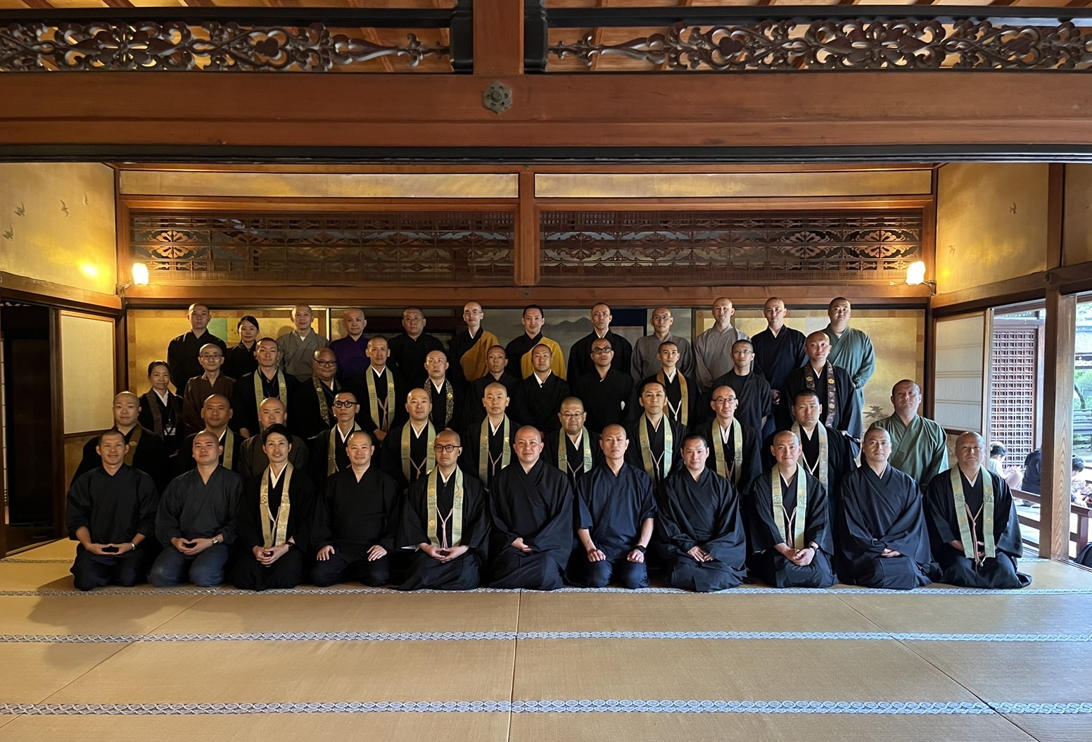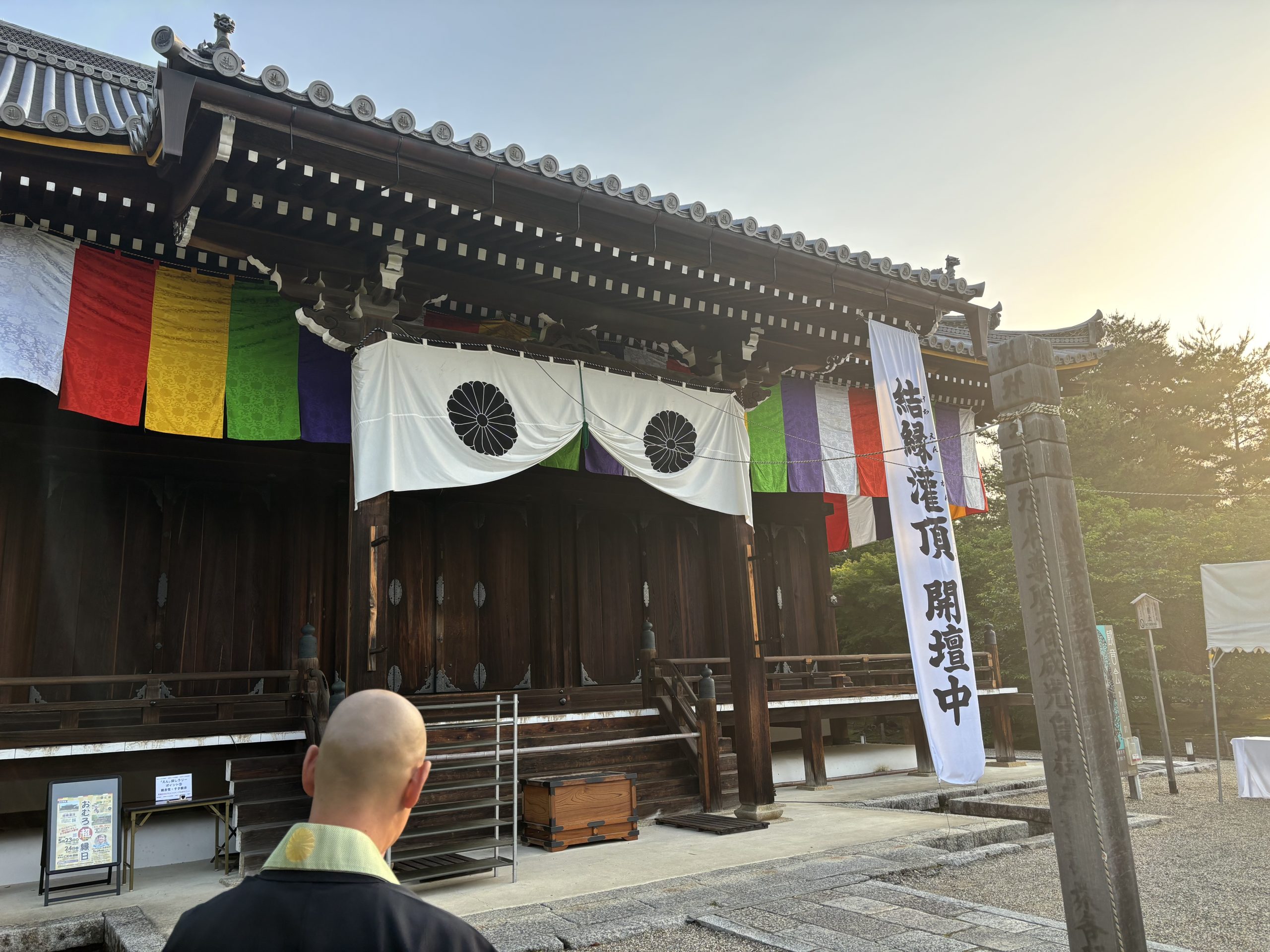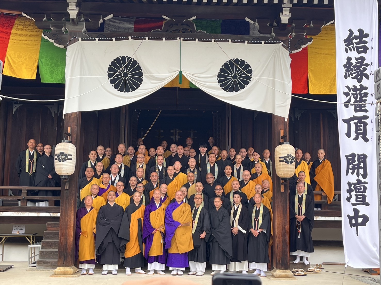 令和7年 5 月 22 日(木)から 24 日(土)に総本山仁和寺観音堂に於いて、真言宗御 室派青年教師会結成 50 周年記念法要「庭儀結縁灌頂三昧耶戒」を開壇いたしました。 22 日の三昧耶戒法要には、総本山仁和寺瀬川大秀門跡猊下に大阿闍梨として登壇賜り、 23 日 24 日の結縁灌頂では 337 名の受者の方が仏様とご縁を結ばれましたことをご報 告させて頂きます。 灌頂部会長として拝命を受けた日から、受者の方に如何にして「自浄の信念を起こさ せ秘密灌頂の法雨を灌げるか」だけを考え続けた日々でした。お大師様はあの日何を視 たのか、何を感じたのかは到底判りえませんが僅かでも近づけるように準備を徹底する 日々の中で、少しずつ形になる瞬間は今想えばこの上ない法悦だったと感じます。そし て結縁灌頂を仁和寺で開壇できたことを思い出し、恍惚感に浸っております。しかし、 問題点や改善点も多く今回経験した事をしっかりと次世代に残すことまでが使命だと 感じております。 他派青年会の皆様、諸先輩方、そして御室派青年僧侶皆様のお力添えのおかげで大き な事故なども無く終えられましたこと心より御礼申し上げます。そして、総本山仁和寺 職員の皆様、特に教学課の皆様には準備から撤収まで私たち以上にご尽力賜りましたこ と深く感謝いたします。 受者の方が仏様とご縁を結ばれたように、私自身も今回の事業で多くの方とご縁を結 べたこと、そして貴重な学びと出会いを頂けたことに改めて感謝いたします。 合掌