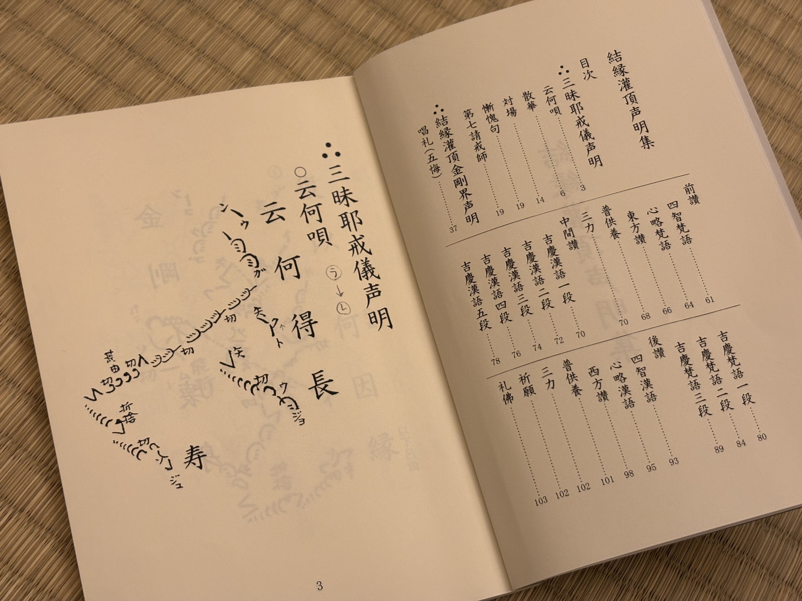 京都支所 遍照寺 生石唯我この度、来る5月開催の結縁灌頂に向けての声明研修会に参加させて頂きました。 講師には現在、仁和密教学院にて声明の修行を担当されておられる守安秀行僧正をお迎えして二日間開催されました。 私自身は高野山専修学院にて声明を教わったのが最初でしたので、後に仁和寺職員として法要に出仕した際には周りと声明が合わず、現場で先輩に本山で唱える声明を教えて頂きました。 結果的に私が日々の勤行で唱えている声明は高野の声明と職員時代に先輩方から教えて貰いました川井宏雄先生の声明が混ざった状態になってしまっています。 また個人的な思いとして、自坊の遍照寺開基の寛朝僧正は真言宗の諸声明を整理し、中曲を作曲されたといわれる声明の大家ですので、私自身が声明を疎かにしては申し訳ないという気持ちもあります。 そのため、守安先生に現在密教学院で唱えている声明を学ぶことにより私の中途半端な声明を改めて矯正できるのではないかという故人的な目論見もありました。 参加してみたところ、常に唱える前後讃などはユリソリの癖を直すくらいでしたが、中間の讃ともなるともう何年も唱えておらず、スカシや吹上などは一人で譜面だけ見ていたら正しい音を発することは難しかったと思います。 非常に有意義で研修会で用いた次第にもかなり手入れをしたのですが、いざ自坊に戻って唱えてみると「あれ?ここの音どんなんだっけ?」「ここって半音上がったかな?」と躓く部分が出てきて、研修中に皆さんと一緒に唱えていた際には出来た気になっていましたが一人だと唱えられない事に気付き、親しい参加者に確認するという情けない状態なのですが、結縁灌頂に向けしっかりと整え、精進してゆく所存であります。